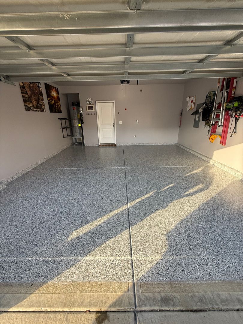 The homeowner is thrilled with his new floor and says the next step is to paint the walls and install cabinets. He is excited to be settled into his new home and we are excited to see his blue Mustang parked on that metallic floor.