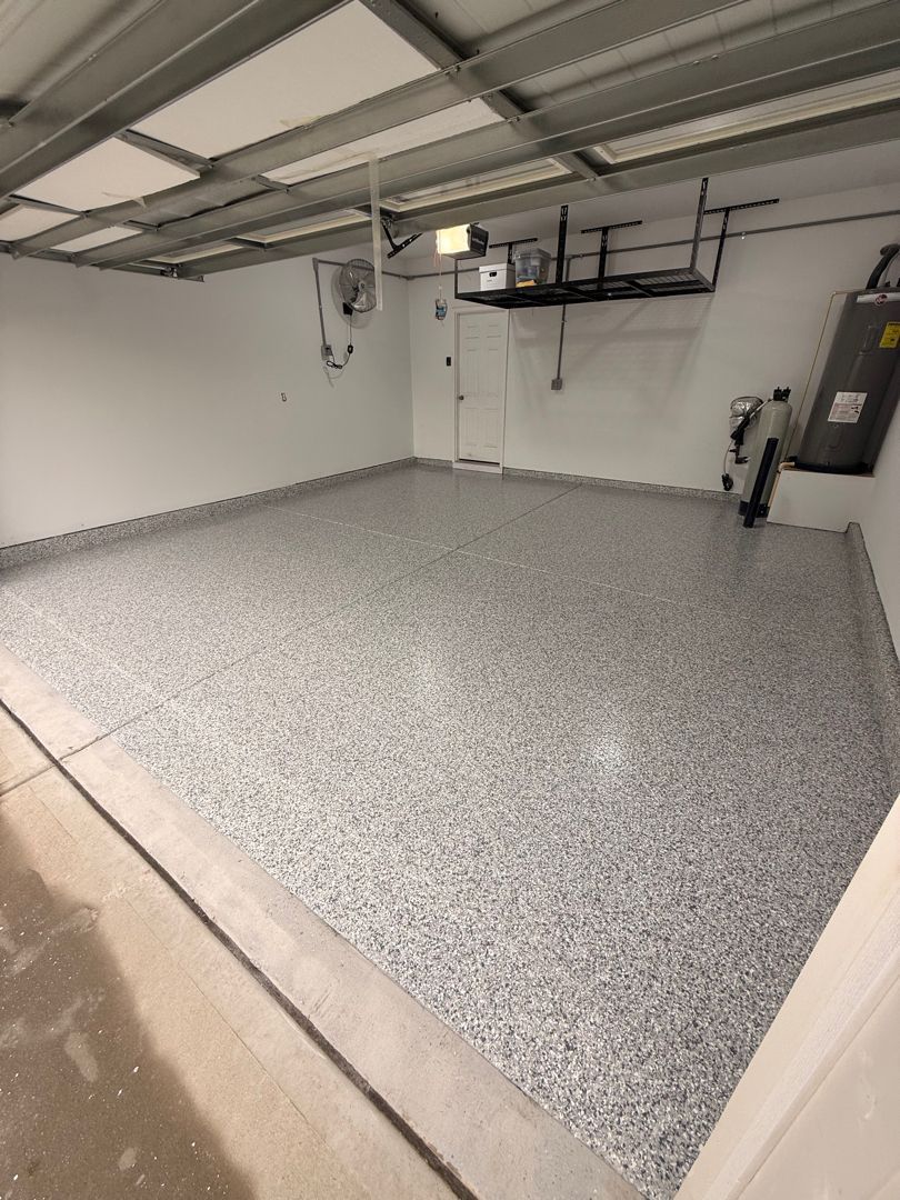 For this installation, our crew prepared the concrete surface, applied our MVB epoxy basecoat, broadcast the 1/4" Gravel flake, and finished the system with a polyaspartic topcoat. The result is a clean, neutral garage floor that looks finished and is built to handle everyday use.